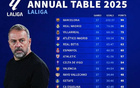 西甲2025年积分榜:巴萨96分第1,皇马86分第2,马竞72分第4